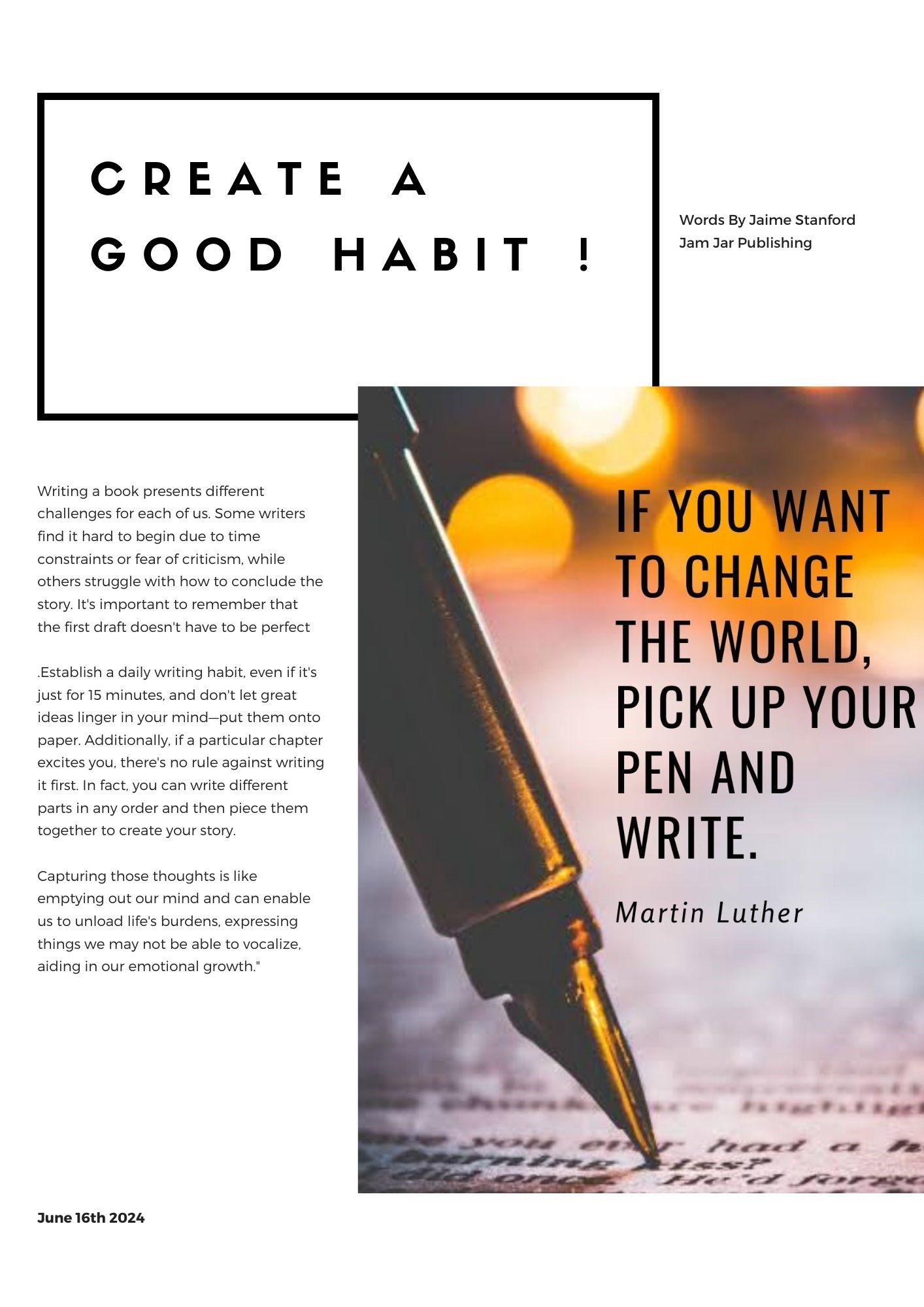 Writing a book presents numerous challenges, and it is crucial not to allow these obstacles to hinder your progress. Always remember your identity as a WRITER. Throughout this writing journey, it is important to practice patience with yourself and acknowledge that you possess a remarkable story to share. This endeavor is not a sprint or a competition; it requires considerable time and effort. Therefore, take your time and avoid pressuring yourself when inspiration seems elusive. Setting your work aside until ideas flow naturally is often more beneficial than forcing the process, which can lead to unnecessary stress. Aim to make this experience enjoyable; while it may demand hard work, remember that you are a WRITER.